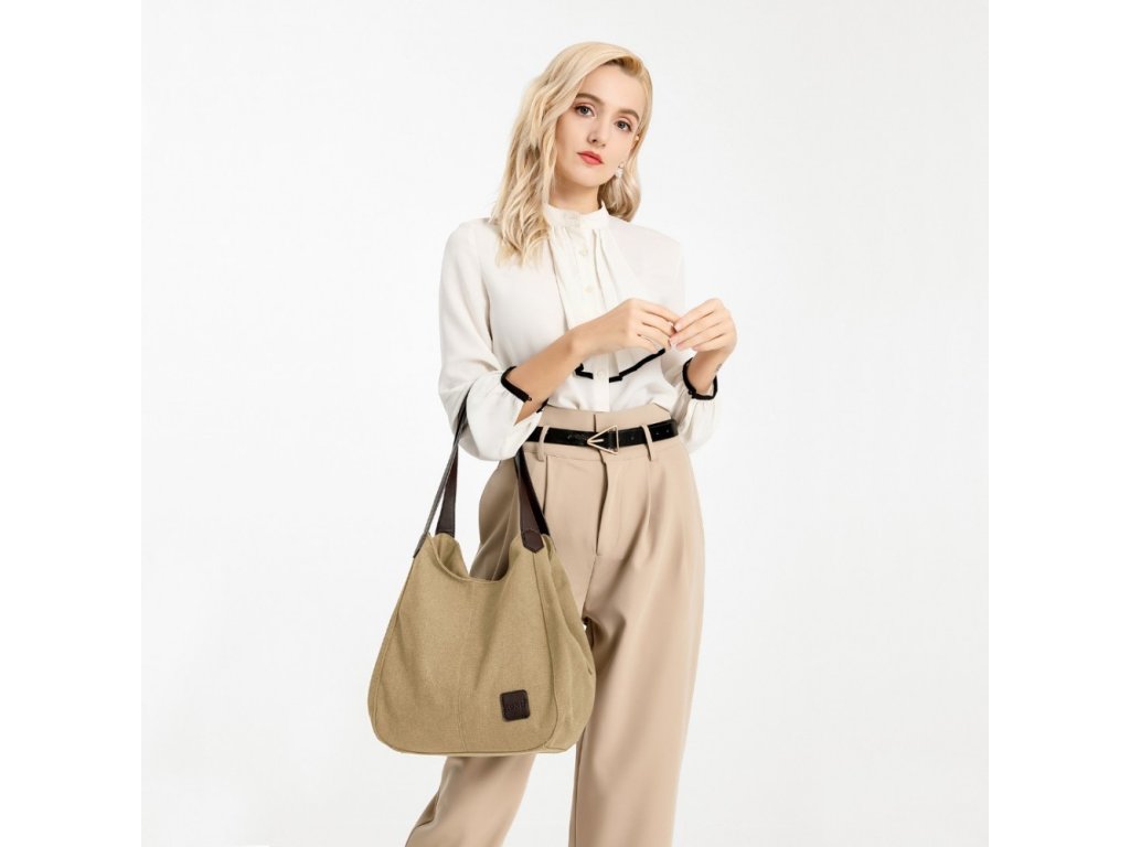 Hnedá štýlová stredne veľká kabelka vyrobená z kvalitného prémiového plátna. Môžete ju nosiť v ruke alebo cez rameno.