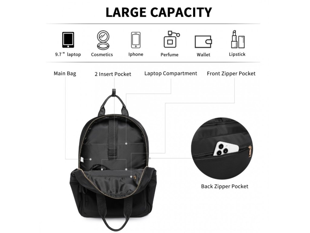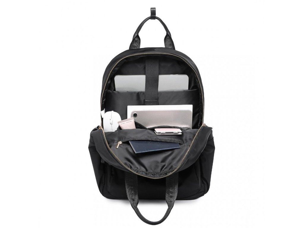 Hlavná priehradka má dvojitý zips pre jednoduchý prístup. Vo vnútri nájdete samostatné vrecko na notebook s uhlopriečkou až 15 palcov, dve otvorené vrecká na nevyhnutnosti, ako sú nabíjačky, a vrecko na zips na osobné veci.