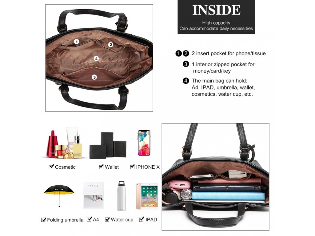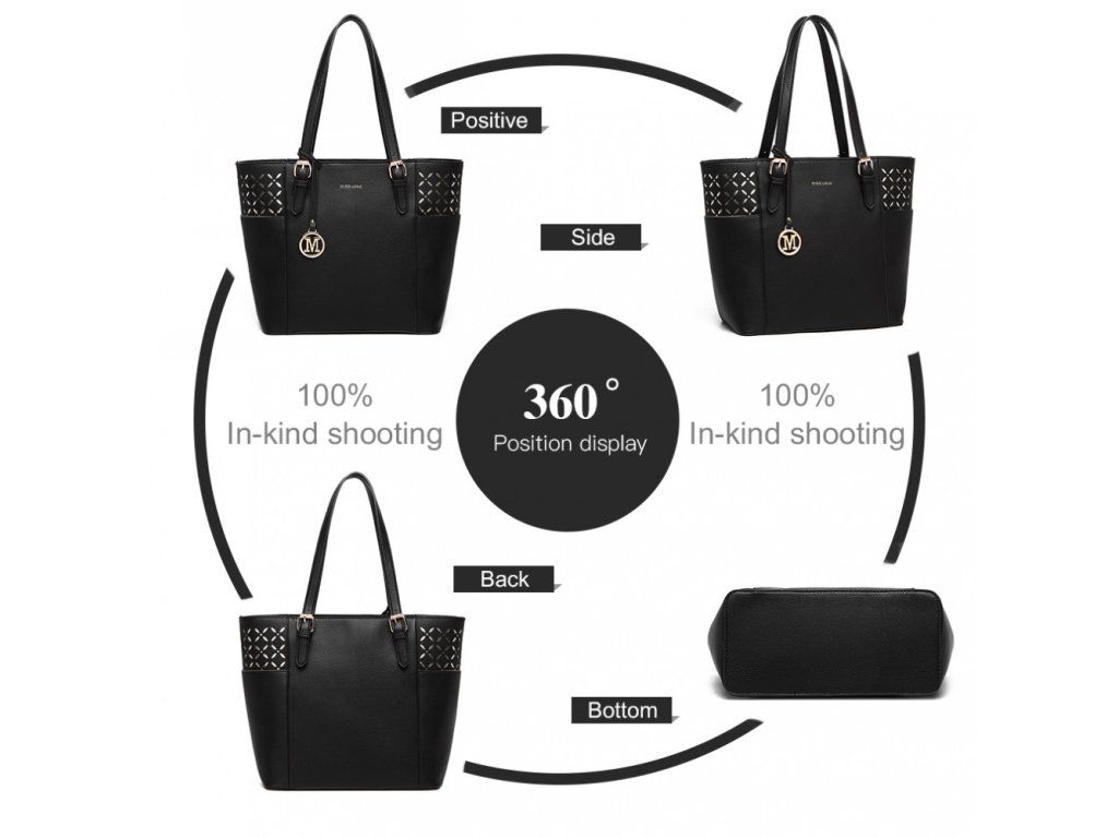 Veľká čierna shopper kabelka na každú príležitosť a ku každému outfitu. Kabelku môžete nosiť v ruke na predlaktí aj na ramene. Hravo v nej odnesiete aj menší nákup a zároveň pôsobí elegantne vďaka zdobeniu po stranách.