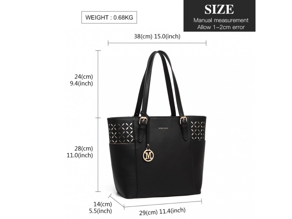 Elegantná kabelka na každú príležitosť a ku každému outfitu je vyrobená z kvalitnej PU kože a ozdobená zlatým kovaním. Vpredu je kabelka ozdobená elegantným zlatým logom MISS LULU a po bokoch ju zdobí elegantný laserom rezaný krížový dizajn s detailom z metalickej PU kože. Kabelka má jednoduchú, minimalistickú ozdobu „Miss Lulu“ a odnímateľný prívesok „M“.